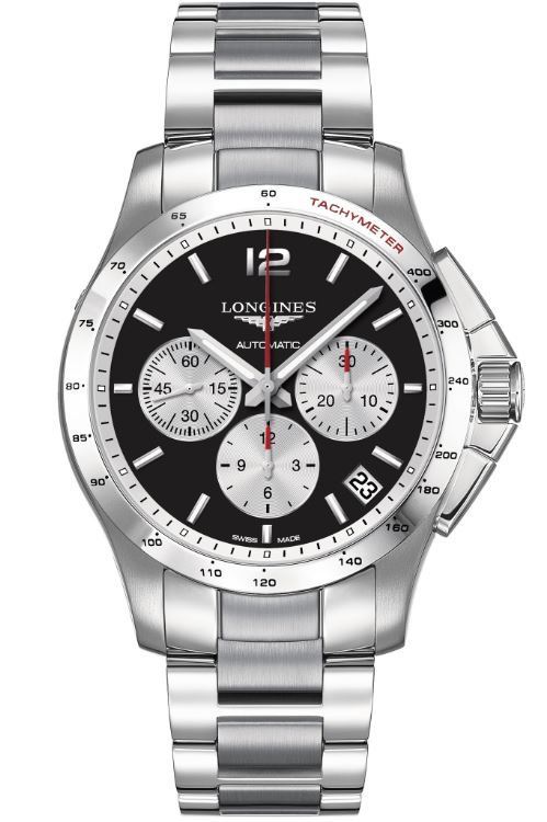 Model: L3.697.4.96.6 - CASE = [Material:Stainless Steel], [Case Diameter:44.5], [Case Thickness:14.7mm], [Bezel:Fixed], [Case Back:Solid], [Water Resistant:50 Meters - 150 Feet], [Crystal:Scratch Resistant Sapphire], DIAL = [Color:Black], MOVEMENT = [Type:Automatic Chronograph], [Crown:Screw Down], BAND = [Clasp:Pushbutton Folding], [Type:Stainless Steel Brushed and Polished], (Usually ships in 1 to 2 weeks.)