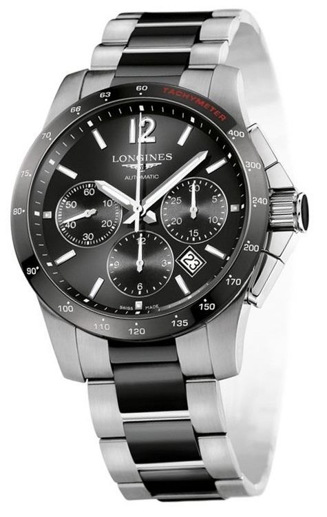 Model: L2.744.4.56.7 - CASE = [Material:Brushed and Polished Stainless Steel], [Case Diameter:41], [Case Thickness:14mm], [Bezel:Fixed], [Case Back:See-thru Sapphire crystal], [Water Resistant:50 Meters - 150 Feet], [Crystal:Scratch Resistant Sapphire],; DIAL = [Color:Black Chronograph with Index Hour Markers],; MOVEMENT = [Type:Automatic Self Winding],; BAND = [Clasp:Push Button Foldover Clasp], [Type:Brushed Steel and Polished Ceramic], (Usually ships in 1 to 2 weeks.)