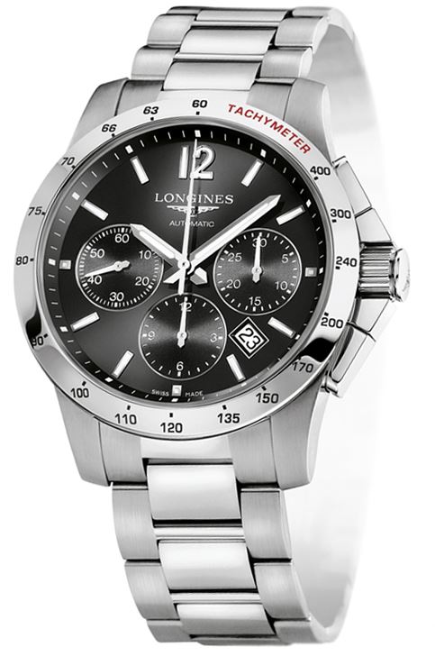 Model: L2.743.4.56.6 - CASE = [Material:Brushed and Polished Stainless Steel], [Case Diameter:41], [Case Thickness:14mm], [Bezel:Fixed], [Case Back:See-thru Sapphire crystal], [Water Resistant:50 Meters - 150 Feet], [Crystal:Scratch Resistant Sapphire], DIAL = [Color:Black Chronograph with Index Hour Markers], MOVEMENT = [Type:Automatic Self Winding], BAND = [Clasp:Push Button Foldover Clasp], [Type:Brushed and Polished Stainless Steel], (Usually ships in 1 to 2 weeks.)