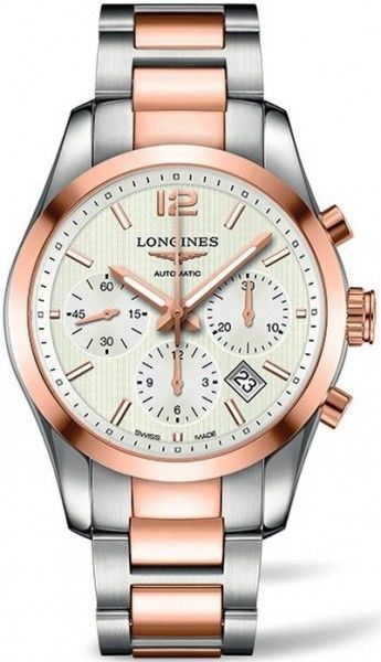 Model: L2.786.5.76.7 - CASE = [Material:18kt Rose Gold with Brushed and Polished Stainless Steel], [Case Diameter:41], [Bezel:18kt Rose Gold Fixed], [Case Back:See-Thru Sapphire], [Water Resistant:50 Meters - 165 Feet], [Crystal:Scratch Resistant Sapphire], DIAL = [Color:Silver Chronograph with Date Between 4 and 5], MOVEMENT = [Type:Automatic Self Winding Calibre L619], BAND = [Clasp:Push Button Folding Clasp with Triple Safety], [Type:18kt Rose Gold with Brushed and Polished Stainless Steel], (Usually ships in 1 to 2 weeks.)
