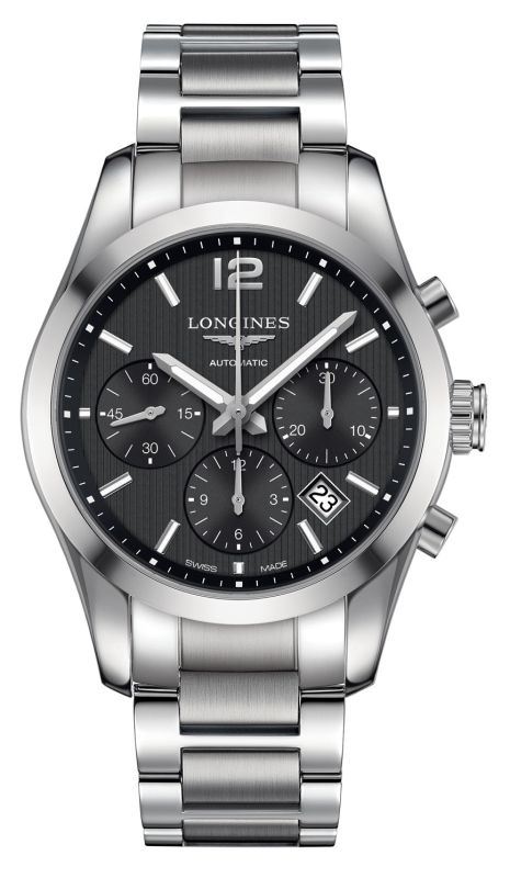 Model: L2.786.4.56.6 - CASE = [Material:Brushed and Polished Stainless Steel], [Case Diameter:41], [Case Thickness:14mm], [Bezel:Fixed], [Case Back:See-Thru Sapphire], [Water Resistant:50 Meters - 165 Feet], [Crystal:Scratch Resistant Sapphire], DIAL = [Color:Black Chronograph with Date Between 4 and 5], MOVEMENT = [Type:Automatic Self Winding], BAND = [Clasp:Deployment Buckle], [Type:Brushed and Polished Stainless Steel], (Usually ships in 1 to 2 weeks.)