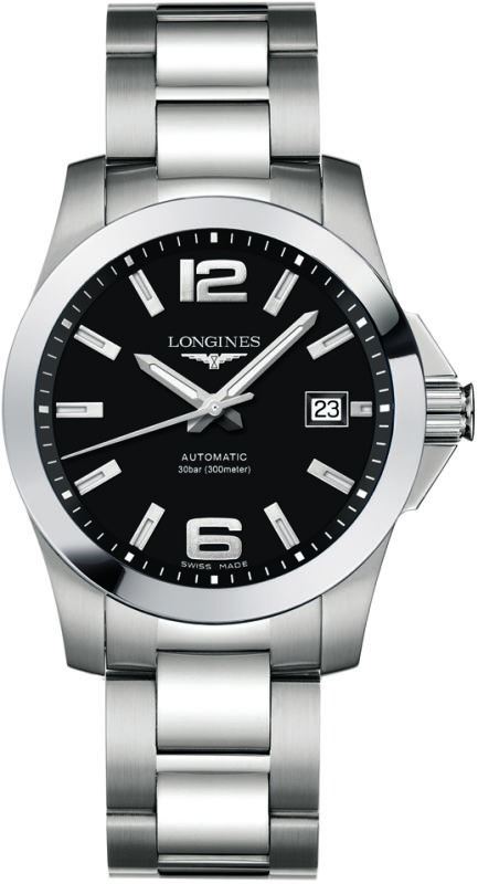 Model: L3.676.4.58.6 - CASE = [Material:Brushed and Polished Stainless Steel], [Case Diameter:39], [Case Thickness:11.5mm], [Case Back:Solid], [Water Resistant:300 Meters - 1000 Feet], [Crystal:Scratch Resistant Sapphire],; DIAL = [Color:Black with Luminescent Hands and Index Markers, Date at 3],; MOVEMENT = [Type:Automatic Self Winding], [Crown:Screw Down],; BAND = [Clasp:Push Button Foldover Clasp], [Type:Brushed and Polished Stainless Steel], (Usually ships in 1 to 2 business days.)