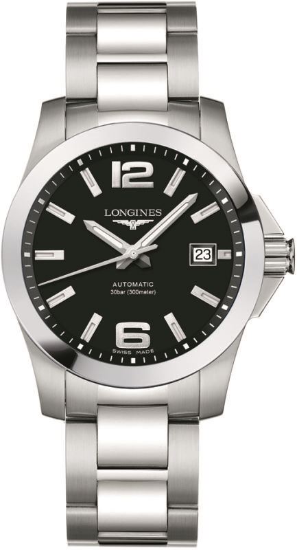 Model: L3.676.4.58.6 - CASE = [Material:Brushed and Polished Stainless Steel], [Case Diameter:39], [Case Thickness:11.5mm], [Case Back:Solid], [Water Resistant:300 Meters - 1000 Feet], [Crystal:Scratch Resistant Sapphire], DIAL = [Color:Black with Luminescent Hands and Index Markers, Date at 3], MOVEMENT = [Type:Automatic Self Winding], [Crown:Screw Down], BAND = [Clasp:Push Button Foldover Clasp], [Type:Brushed and Polished Stainless Steel], (Usually ships in 1 to 2 business days.)