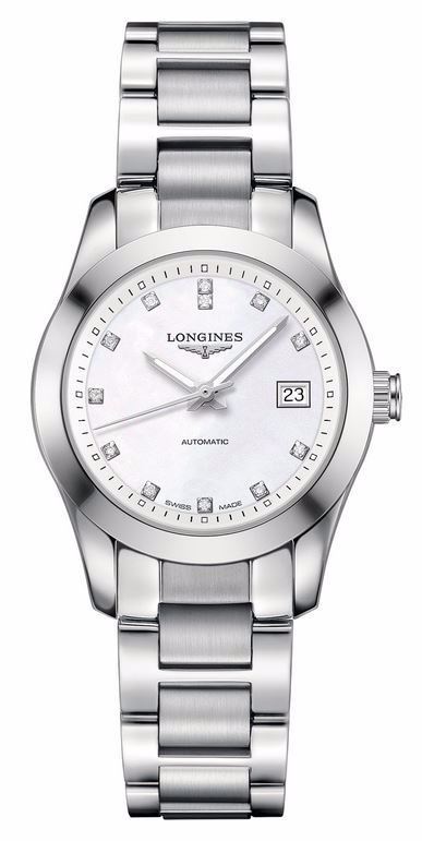 Model: L2.285.4.87.6 - CASE = [Material:Polished Stainless Steel], [Case Diameter:29.5], [Bezel:Fixed], [Case Back:Solid], [Water Resistant:50 Meters - 165 Feet], [Crystal:Scratch Resistant Sapphire],; DIAL = [Color:Mother of Pearl with Diamond Hour Markers],; MOVEMENT = [Type:Automatic Self Winding], [Crown:Screw Down],; BAND = [Clasp:Push Button Foldover Clasp], [Type:Brushed and Polished Stainless Steel], (Usually ships in 1 to 2 weeks.)