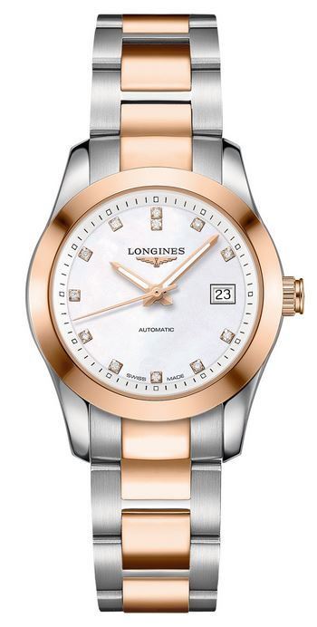 Model: L2.285.5.87.7 - CASE = [Material:Polished 18kt Rose Gold and Stainless Steel], [Case Diameter:29.5], [Bezel:Fixed 18kt Rose Gold], [Case Back:Solid], [Water Resistant:50 Meters - 165 Feet], [Crystal:Scratch Resistant Sapphire], DIAL = [Color:Mother of Pearl with Diamond Hour Markers], MOVEMENT = [Type:Automatic Self Winding Caliber L595], [Crown:Screw Down], BAND = [Clasp:Push Button Foldover Clasp], [Type:Brushed and Polished 18kt Rose Gold with Stainless Steel], (Usually ships in 1 to 2 weeks.)