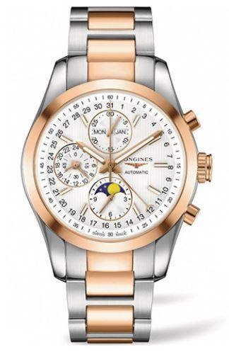 Model: L2.798.5.72.7 - CASE = [Material:Stainless Steel And 18kt Rose Gold], [Case Diameter:42], [Bezel:Fixed], [Case Back:See-Thru Sapphire], [Water Resistant:50 Meters - 165 Feet], [Crystal:Scratch Resistant Sapphire],; DIAL = [Color:Silver],; MOVEMENT = [Type:Automatic Self Winding Chronograph Moon Phase], [Crown:Screw Down],; BAND = [Clasp:Triple Safety Folding Clasp With Push-peice Opening Mechanism], [Type:Stainless Steel And 18kt Rose Gold], (Usually ships in 2 to 4 weeks.)