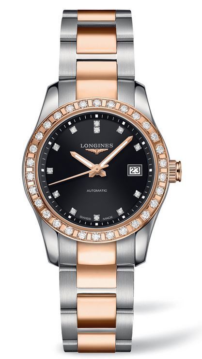 Model: L2.285.5.57.7 - CASE = [Material:Stainless Steel And Rose Gold], [Case Diameter:29.5], [Bezel:Fixed with Diamonds], [Case Back:Push In], [Water Resistant:50 Meters - 165 feet], [Crystal:Scratch Resistant Sapphire], DIAL = [Color:Black with Diamond Markers], MOVEMENT = [Type:Automatic], [Crown:Screw Down], BAND = [Clasp:Push Button Folding Clasp], [Type:Stainless Steel and Rose Gold Brushed and Polished], (Usually ships in 1 to 2 weeks.)