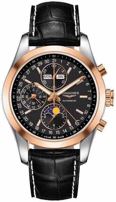 Model: L2.798.5.52.3 - CASE = [Material:Stainless Steel and Rose Gold], [Case Diameter:42], [Case Thickness:14.5mm], [Bezel:Fixed], [Case Back:Skeleton], [Water Resistant:30 Meters - 100 Feet], [Crystal:Scratch Resistant Sapphire],; DIAL = [Color:Black],; MOVEMENT = [Type:Automatic], [Crown:Push In],; BAND = [Clasp:Deployment], [Type:Black Alligator Leather], (Usually ships in 1 to 2 weeks.)