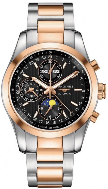 Model: L2.798.5.52.7 - CASE = [Material:Stainless Steel and Rose Gold], [Case Diameter:42], [Case Thickness:14.5mm], [Bezel:Fixed], [Case Back:Skeleton], [Water Resistant:30 Meters - 100 Feet], [Crystal:Scratch Resistant Sapphire],; DIAL = [Color:Black],; MOVEMENT = [Type:Automatic], [Crown:Push In],; BAND = [Clasp:Folding], [Type:Stainless Steel and Rose Gold], (Usually ships in 1 to 2 weeks.)