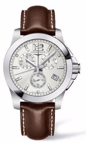 Model: L3.660.4.76.5 - CASE = [Material:Stainless Steel], [Case Diameter:41], [Case Thickness:11.5mm], [Bezel:Fixed], [Case Back:Solid], [Water Resistant:300 Meters - 1000 Feet], [Crystal:Scratch Resistant Sapphire],; DIAL = [Color:Silver],; MOVEMENT = [Type:Quartz Chronograph], [Crown:Screw Down],; BAND = [Clasp:Tang], [Type:Brown Leather], (In Stock - Ready to ship.)