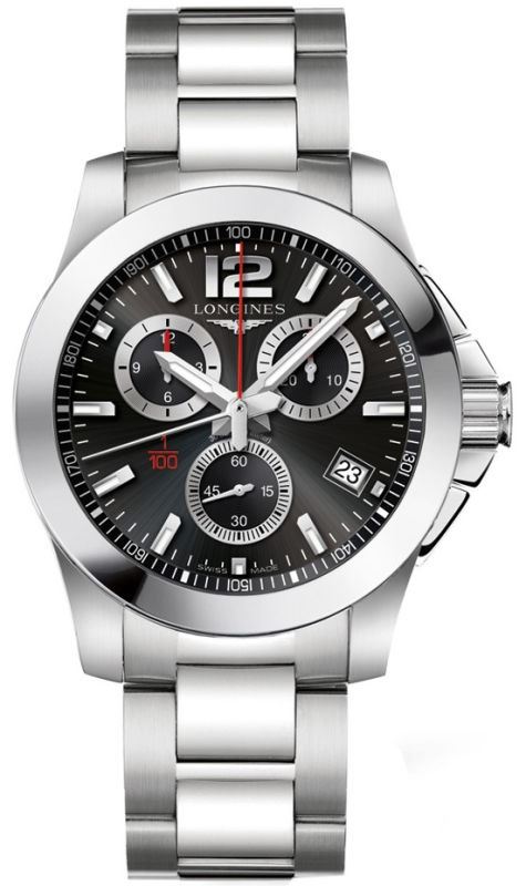 Model: L3.700.4.56.6 - CASE = [Material:Brushed and Polished Stainless Steel], [Case Diameter:41], [Case Thickness:15.15mm], [Bezel:Fixed], [Case Back:Solid], [Water Resistant:300 Meters - 1000 Feet], [Crystal:Scratch Resistant Sapphire],; DIAL = [Color:Black Chronograph],; MOVEMENT = [Type:Battery Operated Quartz], [Crown:Screw Down],; BAND = [Clasp:Push Button Folding], [Type:Brushed and Polished Stainless Steel], (In Stock - Ready to ship.)