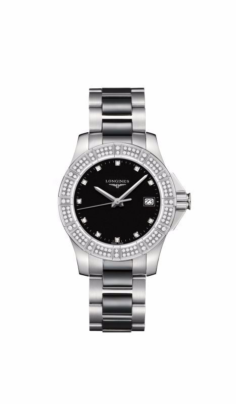 Model: L3.280.0.57.7 - CASE = [Material:Brushed and Polished Stainless Steel], [Case Diameter:35], [Case Thickness:9mm], [Bezel:Set with 2 Rows of Diamonds (120 Diamonds .532 Ct Total Weight)], [Case Back:Solid], [Water Resistant:50 Meters - 165 Feet], [Crystal:Scratch Resistant Sapphire],; DIAL = [Color:Black with Diamond Hour Markers and Date at 3],; MOVEMENT = [Type:Battery Powered Quartz],; BAND = [Clasp:Deployment Buckle], [Type:Stainless Steel and Black Ceramic Inner Links], (Usually ships in 1 to 2 weeks.)