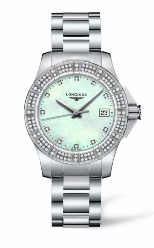 Model: L3.280.0.87.6 - CASE = [Material:Stainless Steel], [Case Diameter:35], [Bezel:Set with Diamonds], [Water Resistant:50 Meters - 165 Feet], [Crystal:Scratch Resistant Sapphire],; DIAL = [Color:White Mother of Pearl with Diamond Hour Markers],; MOVEMENT = [Type:Quartz], [Crown:Screw Down],; BAND = [Clasp:Deployment], [Type:Stainless Steel], (Usually ships in 1 to 2 weeks.)
