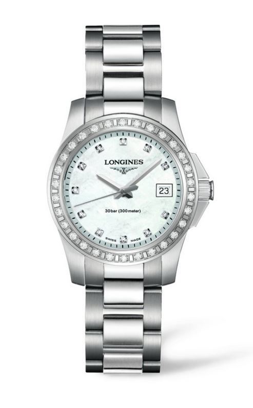 Model: L3.258.0.89.6 - CASE = [Material:Stainless Steel], [Case Diameter:29.5], [Water Resistant:300 Meters - 1000 Feet], [Crystal:Scratch Resistant Sapphire], DIAL = [Color:White Mother of Pearl with Diamond Hour Markers], MOVEMENT = [Type:Quartz], [Crown:Screw Down], BAND = [Clasp:Folding], [Type:Stainless Steel], (Usually ships in 1 to 2 weeks.)