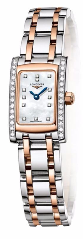 Model: L5.158.5.89.7 - CASE = [Material:Rose Gold and Stainless Steel], [Case Diameter:16], [Case Thickness:5.5mm], [Bezel:Set with 28 Diamonds (.218ct)], [Case Back:Solid], [Water Resistant:30 Meters / 100 Feet], [Crystal:Scratch Resistant Sapphire],; DIAL = [Color:White Mother of Pearl with 13 Diamond Hour Markers (.032ct)],; MOVEMENT = [Type:Battery Powered Quartz],; BAND = [Clasp:Hidden Folding Push Button], [Type:Rose Gold and Stainless Steel], (Usually ships in 2 to 4 weeks.)