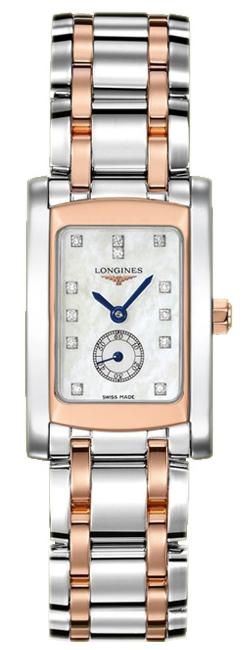 Model: L5.155.5.88.7 - Case,; MATERIAL18K ROSE GOLD AND STAINLESS STEEL = [Case Diameter19.8], [BezelFixed], [Case BackSolid], [Water Resistant30 Meters - 100 Feet], [CrystalScratch Resistant Sapphire], Dial,; COLORWHITE MOTHER OF PEARL WITH DIAMOND HOUR MARKERS AND SECONDS SUB-DIAL AT 6 = Movement,; TYPEBATTERY POWERED QUARTZ = Band,; CLASPHIDDEN FOLDING CLASP = [Type18k Rose Gold and Stainless Steel], (Usually ships in 2 to 4 weeks.)