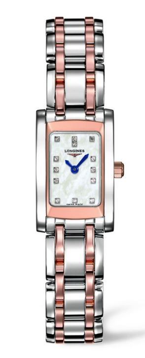 Model: L5.158.5.88.7 - CASE = [Material:Stainless Steel and Rose Gold], [Case Diameter:20.4], [Water Resistant:30 Meters - 100 Feet], [Crystal:Scratch Resistant Sapphire], DIAL = [Color:White Mother of Pearl with Blue Hands and Diamond Hour Markers], MOVEMENT = [Type:Quartz], BAND = [Clasp:Folding], [Type:Stainless Steel and Rose Gold], (Usually ships in 2 to 4 weeks.)