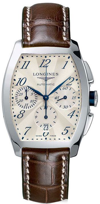 Model: L2.643.4.73.4 - CASE = [Material:Polished Stainless Steel], [Case Diameter:34.9], [Case Thickness:12.8mm], [Bezel:Fixed], [Water Resistant:30 Meters - 100 Feet], [Crystal:Scratch Resistant Sapphire], DIAL = [Color:Silver Chronograph with Blue Hands and Arabic Numerals, Date at 6], MOVEMENT = [Type:Automatic Self Winding], BAND = [Clasp:Hidden Folding Deployment], [Type:Brown Crocodile Leather], (Usually ships in 1 to 2 weeks.)