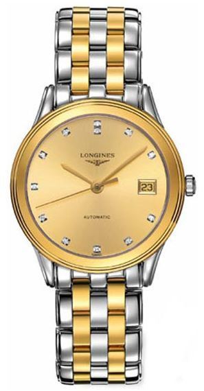 Model: L4.774.3.37.7 - CASE = [Material:Polished 18K Yellow Gold Tone and Stainless Steel], [Case Diameter:35.6], [Bezel:Fixed], [Case Back:Solid], [Water Resistant:30 Meters / 100 Feet], [Crystal:Scratch Resistant Sapphire], DIAL = [Color:Champagne with Diamond Hour Markers and dat at 3], MOVEMENT = [Type:Automatic Self Winding], BAND = [Clasp:Hidden Folding Push Button], [Type:Polished Yellow Gold and Stainless Steel], (Usually ships in 1 to 2 weeks.)