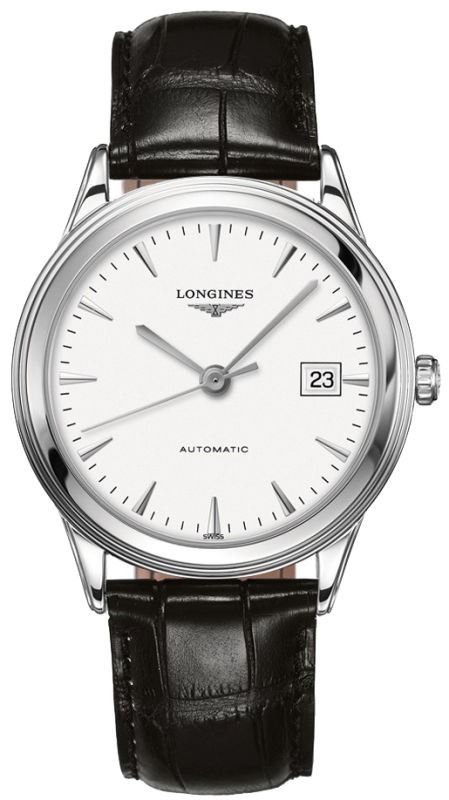Model: L4.874.4.12.2 - CASE = [Material:Stainless Steel], [Case Diameter:38.5], [Case Thickness:8mm], [Bezel:Fixed], [Case Back:Skeleton], [Water Resistant:30 Meters - 100 Feet], [Crystal:Scratch Resistant Sapphire],; DIAL = [Color:White with Index Hour Markers],; MOVEMENT = [Type:Automatic], [Crown:Push In],; BAND = [Clasp:Tang], [Type:Black Alligator Leather], (In Stock - Ready to ship.)