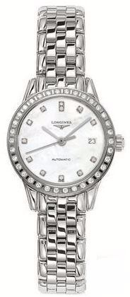 Model: L4.274.0.87.6 - CASE = [Material:Polished Stainless Steel], [Case Diameter:26], [Bezel:Fixed with Diamonds], [Case Back:Solid], [Water Resistant:30 Meters / 100 Feet], [Crystal:Scratch Resistant Sapphire],; DIAL = [Color:White Mother of Pearl with Diamond Markers],; MOVEMENT = [Type:Automatic Self Winding],; BAND = [Clasp:Hidden Folding], [Type:Polished Stainless Steel], (Usually ships in 1 to 2 business days.)