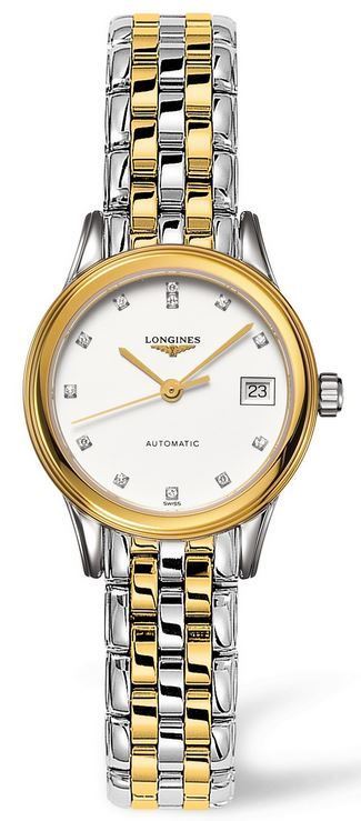 Model: L4.274.3.27.7 - Case,; MATERIALPOLISHED 18K YELLOW GOLD TONE AND STAINLESS STEEL = [Case Diameter26], [Case Thickness8mm], [BezelFixed], [Case BackSolid], [Water Resistant30 Meters / 100 Feet], [CrystalScratch Resistant Sapphire], Dial,; COLORWHITE WITH DATE AT 3 AND DIAMOND HOUR MARKERS = Movement,; TYPEAUTOMATIC SELF WINDING = Band,; CLASPHIDDEN FOLDING PUSH BUTTON = [TypePolished Yellow Gold and Stainless Steel], (In Stock - Ready to ship.)