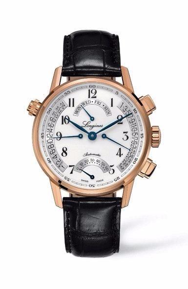 Model: L4.797.8.23.2 - CASE = [Material:18kt Rose Gold], [Case Diameter:41], [Case Thickness:16.1mm], [Bezel:Fixed], [Case Back:Solid], [Water Resistant:30 Meters - 100 Feet], [Crystal:Scratch Resistant Sapphire],; DIAL = [Color:White with Black Arabic Numerals],; MOVEMENT = [Type:Automatic GMT Time Zone, Retrograde], [Crown:Push In],; BAND = [Clasp:Deployment], [Type:Black Alligator Leather], (Usually ships in 2 to 4 weeks.)