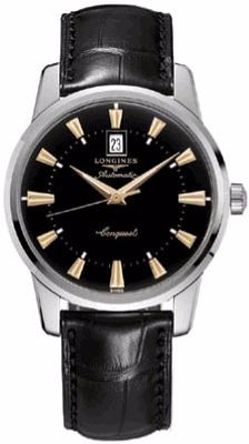Model: L1.645.4.52.4 - CASE = [Material:Stainless Steel], [Case Diameter:40], [Bezel:Fixed], [Water Resistant:30 Meters - 100 Feet], [Crystal:Scratch Resistant Sapphire],; DIAL = [Color:Black with Date at 12 and Gold Hands & Hour Markers],; MOVEMENT = [Type:Automatic Self Winding],; BAND = [Clasp:Tang Buckle], [Type:Black Crocodile Leather], (Usually ships in 1 to 2 business days.)