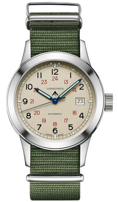 Model: L2.832.4.73.5 - CASE = [Material:Stainless Steel], [Case Diameter:40], [Bezel:Fixed], [Water Resistant:30 Meters - 100 Feet], [Crystal:Scratch Resistant Sapphire], DIAL = [Color:Ivory with Arabic Numerals and Luminious Hands], MOVEMENT = [Type:Automatic], [Crown:Push In], BAND = [Clasp:Tang], [Type:Green Synthentic Strap], (Usually ships in 1 to 2 weeks.)