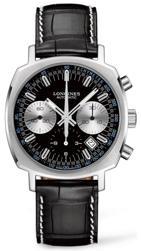 Model: L2.791.4.52.0 - CASE = [Material:Stainless Steel], [Case Diameter:40], [Bezel:Fixed], [Case Back:Solid], [Water Resistant:30 Meters - 100 Feet], [Crystal:Scratch Resistant Sapphire], DIAL = [Color:Black Chronograph with Date Between 4 and 5], MOVEMENT = [Type:Automatic Self Winding], BAND = [Clasp:Tang Buckle], [Type:Black Alligator Leather], (In Stock - Ready to ship.)