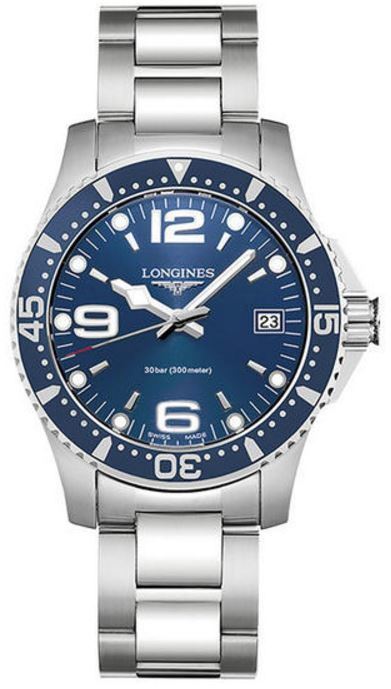 Model: L3.340.4.96.6 - CASE = [Material:Stainless Steel], [Case Diameter:34], [Case Thickness:10.8mm], [Bezel:Uni-Directional Rotating], [Case Back:Solid], [Water Resistant:300 Meters - 1000 Feet], [Crystal:Scratch Resistant Sapphire], DIAL = [Color:Blue], MOVEMENT = [Type:Quartz], [Crown:Screw Down], BAND = [Clasp:Deployment], [Type:Stainless Steel], (In Stock - Ready to ship.)