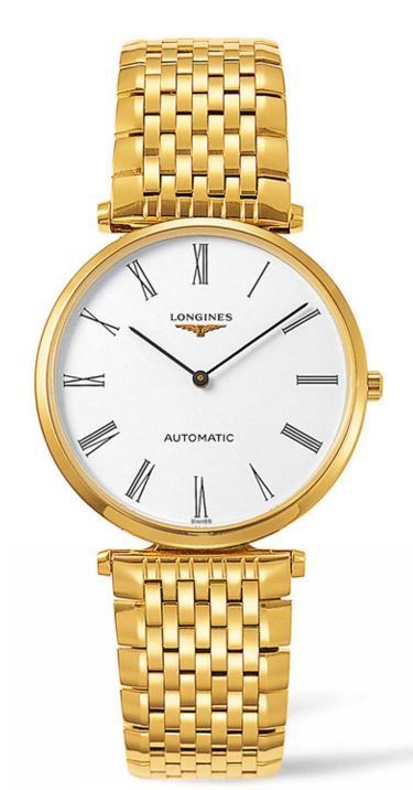 Model: L4.908.2.11.8 - CASE = [Material:Gold PVD Stainless Steel], [Case Diameter:36], [Bezel:Fixed], [Case Back:Solid], [Water Resistant:30 Meters - 100 Feet], [Crystal:Scratch Resistant Sapphire], DIAL = [Color:White], MOVEMENT = [Type:Automatic], [Crown:Push In], BAND = [Clasp:Folding], [Type:Gold PVD Stainless Steel], (Usually ships in 1 to 2 weeks.)