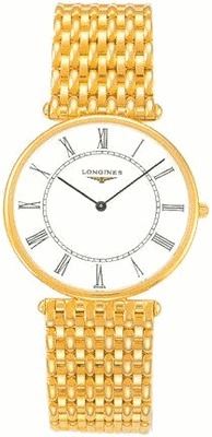 Model: L4.691.6.11.6 - CASE = [Material:Solid 18k Yellow Gold], [Case Diameter:33], [Case Thickness:5mm], [Bezel:Fixed], [Case Back:Solid], [Water Resistant:30 Meters / 100 Feet], [Crystal:Scratch Resistant Sapphire],; DIAL = [Color:White with Black Roman Numeral],; MOVEMENT = [Type:Battery Powered Quartz],; BAND = [Clasp:Hidden Folding Push Button], [Type:Solid 18k Yellow Gold], (Usually ships in 1 to 2 weeks.)
