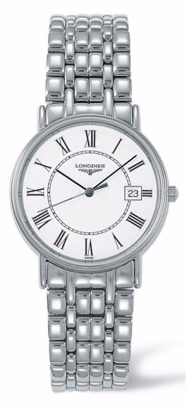 Model: L4.720.4.11.6 - CASE = [Material:Polished Stainless Steel], [Case Diameter:33], [Bezel:Fixed], [Case Back:Solid], [Water Resistant:30 Meters / 100 Feet], [Crystal:Scratch Resistant Sapphire],; DIAL = [Color:White Roman Numeral with Date at 3],; MOVEMENT = [Type:Battery Powered Quartz],; BAND = [Clasp:Hidden Folding], [Type:Polished Stainless Steel], (In Stock - Ready to ship.)