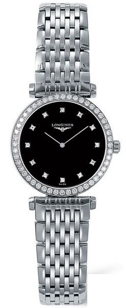 Model: L4.241.0.58.6 - CASE = [Material:Polished Stainless Steel], [Case Diameter:24.5], [Case Thickness:5mm], [Bezel:Fixed with 48 Diamonds], [Case Back:Solid], [Water Resistant:30 Meters / 100 Feet], [Crystal:Scratch Resistant Sapphire],; DIAL = [Color:Black with Diamonds],; MOVEMENT = [Type:Battery Powered Quartz],; BAND = [Clasp:Hidden Folding Push Button], [Type:Polished Stainless Steel], (Usually ships in 1 to 2 weeks.)