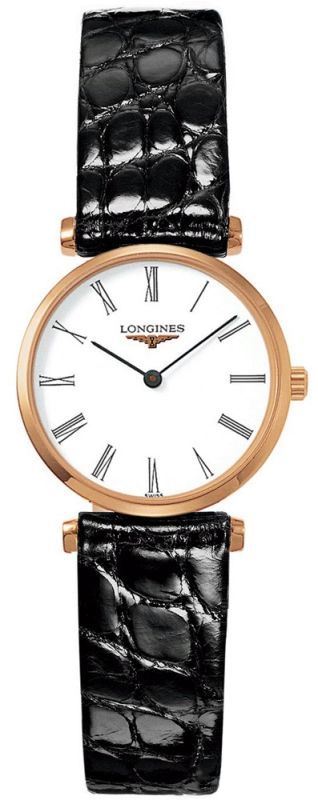 Model: L4.209.1.91.2 - CASE = [Material:Polished Rose Gold Tone], [Case Diameter:24.5], [Case Thickness:5mm], [Bezel:Fixed], [Case Back:Solid], [Water Resistant:30 Meters / 100 Feet], [Crystal:Scratch Resistant Sapphire], DIAL = [Color:White Roman Numeral], MOVEMENT = [Type:Battery Powered Quartz], BAND = [Clasp:Tang Buckle], [Type:Black Alligator Leather], (In Stock - Ready to ship.)