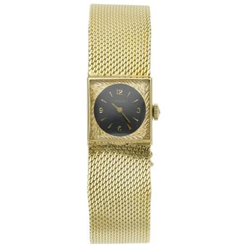<B>Longines Lady's 14k Gold Integral Bracelet Wristwatch</B></I><BR><BR>Case: 18 mm, square, 14k yellow gold with pressure sealed caseback<BR>Dial: black enamel with applied Arabic numerals at 3, 6, 9 & 12 o' clock positions together with Dart Hour Indexes, goldtone "Baton" hands, mineral crystal, marked Longines<BR>Movement: 17 jewels, unadjusted, manual wind reference #13948505, 410<BR>Bracelet: 14k yellow gold integral woven mesh bracelet with concealed box clasp and figure-8 safety; 6-3/4 inches<BR>Signed: triple signed Longines on the dial, movement and case<BR><BR> <B>Condition Report:</B> Normal signs of wear as appropriate with age. Bracelet displays very slight warping. Original Longines crown. Watch is currently not in working order. Gross weight: 38.60 grams.<BR><BR><b>Shipping:</b> Miscellaneous Collectibles, Smal (<a target="_blank" href="http://www.heritageauctions.com/common/shipping.php">view shipping information</a>)