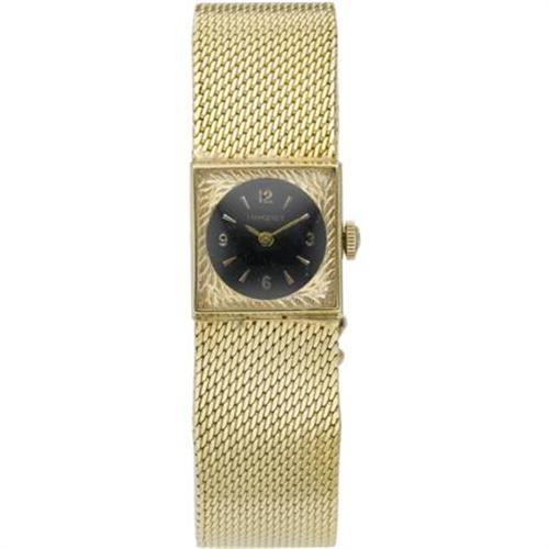<B>Longines Lady's 14k Gold Integral Bracelet Wristwatch</B></I><BR><BR>Case: 18 mm, square, 14k yellow gold with pressure sealed caseback<BR>Dial: black enamel with applied Arabic numerals at 3, 6, 9 & 12 o' clock positions together with Dart Hour Indexes, goldtone "Baton" hands, mineral crystal, marked Longines<BR>Movement: 17 jewels, unadjusted, manual wind reference #13948505, 410<BR>Bracelet: 14k yellow gold integral woven mesh bracelet with concealed box clasp and figure-8 safety; 6-3/4 inches<BR>Signed: triple signed Longines on the dial, movement and case<BR><BR><BR><BR><b>Shipping:</b> Miscellaneous Collectibles, Smal (<a target="_blank" href="http://www.heritageauctions.com/common/shipping.php">view shipping information</a>)