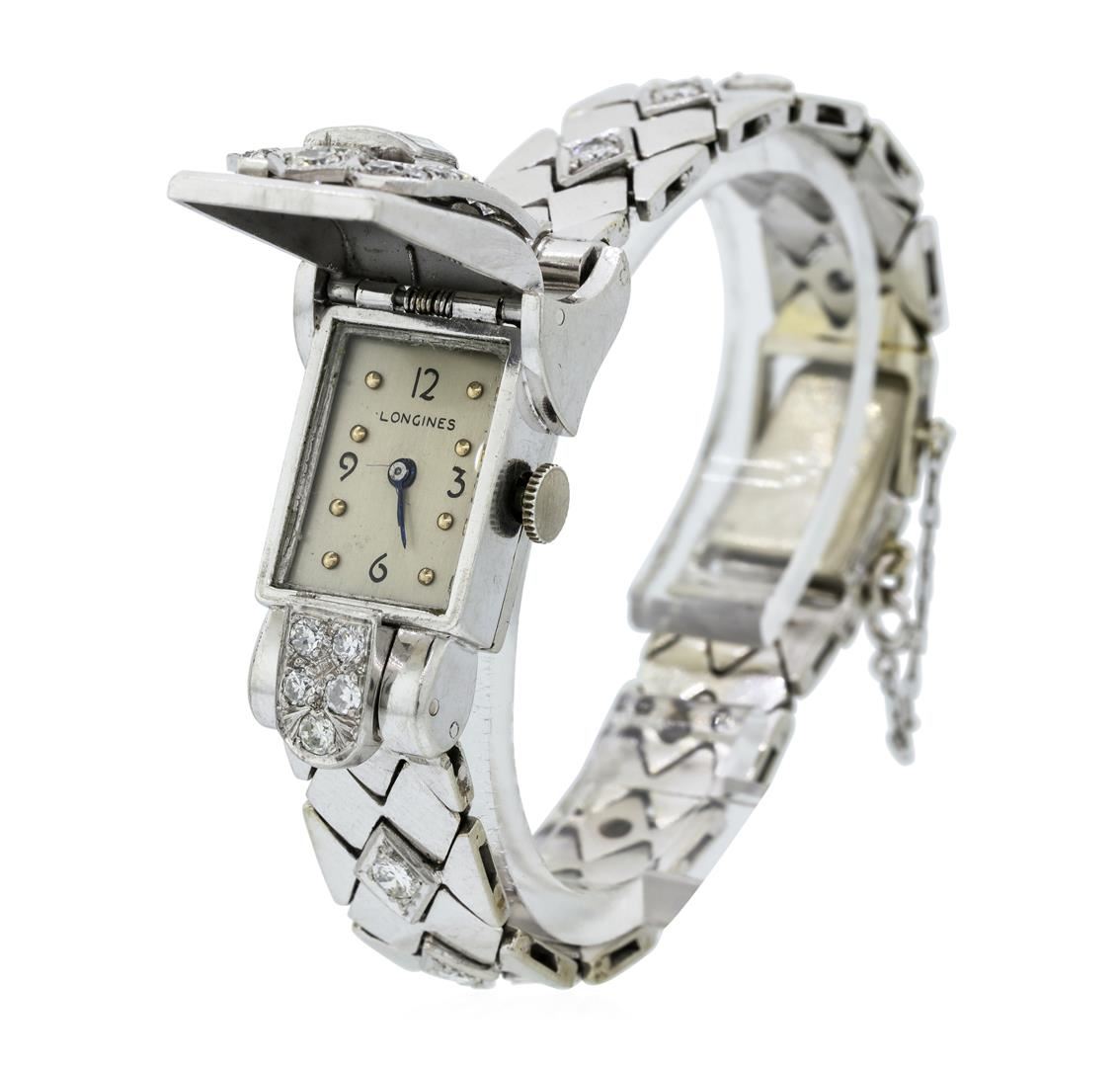 One lady's, hand fabricated Longines retangular shape case bracelet watch electronically tested platinum and 14KT white gold, Crown: pull-out, Crystal: flat glass, Movement: manual wind 17 jewel, Dial: silver satin with baton, pointed type hands and gold dot marker numerals, Bracelet: matching link style band, Condition: G-4 average. The featured wristwatch has a platinum case with an attached 14KT white gold strap. Containing: Four prong set round brilliant cut diamonds, measuring 3.20 - 2.90 x 1.89mm (depth est.) approximate total weight of 4 Stones = 0.40ct. Graded in the setting. Color H - I Clarity SI-1 to SI-2 Cut Good Thirty-Seven prong set round brilliant cut diamonds, measuring 2.60 - 2.10 x 1.46mm (depth est.) approximate total weight of 37 Stones = 1.80ct. Graded in the setting. Color H - J Clarity SI-1 to I-1 Cut Good Three channel set baguette cut diamonds, measuring from 4.00 x 2.50 x 2.13mm (depth est.) to 4.10 x 2.70 x 2.30mm (depth est.) approximate total weight of 3 Stones = 0.64ct. Graded in the setting. Color G - H Clarity VS-1 to VS-2 Cut Very Good. Total Weight of Diamonds 2.84ct.. Total Weight of Watch 54.90gm GAS Appraised at $9090.00. GAS Appraised at $9,090.00.