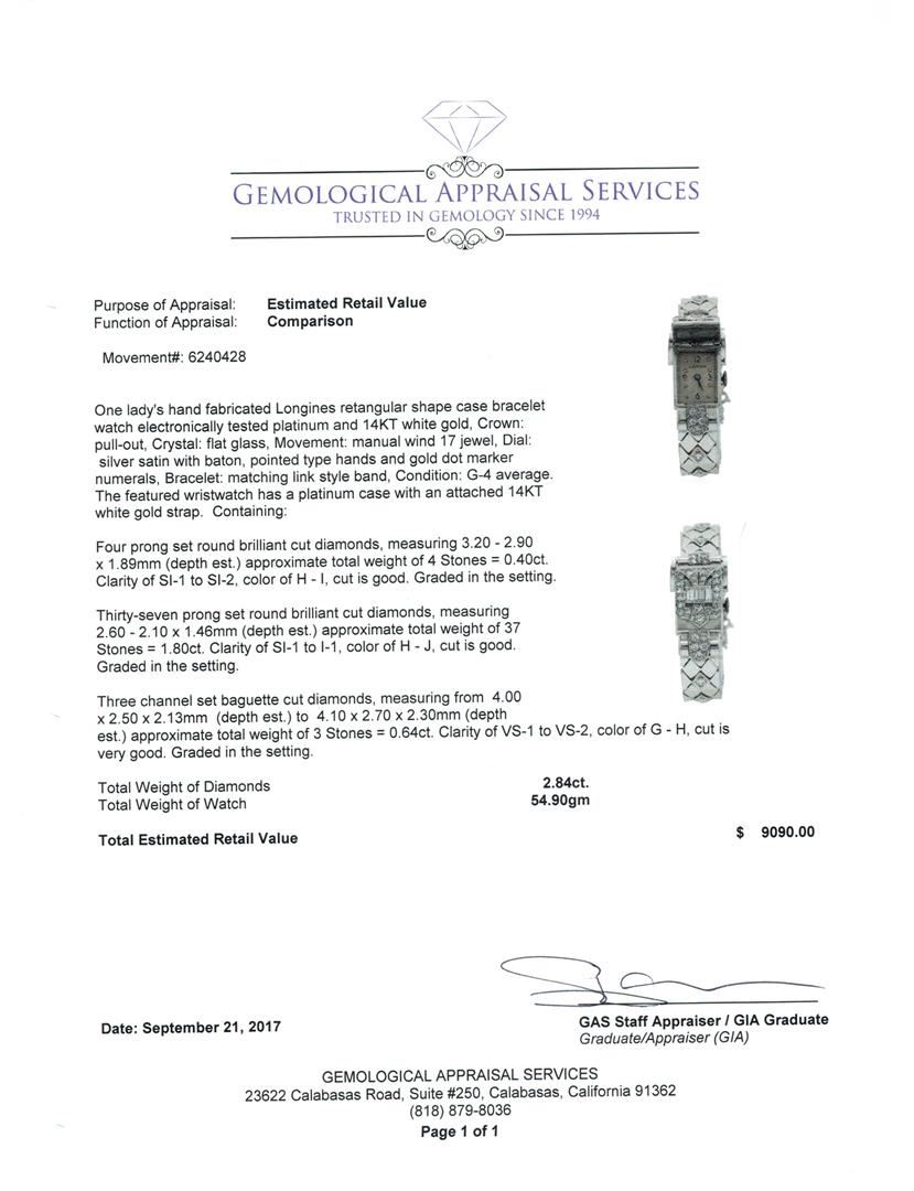One lady's, hand fabricated Longines retangular shape case bracelet watch electronically tested platinum and 14KT white gold, Crown: pull-out, Crystal: flat glass, Movement: manual wind 17 jewel, Dial: silver satin with baton, pointed type hands and gold dot marker numerals, Bracelet: matching link style band, Condition: G-4 average. The featured wristwatch has a platinum case with an attached 14KT white gold strap. Containing: Four prong set round brilliant cut diamonds, measuring 3.20 - 2.90 x 1.89mm (depth est.) approximate total weight of 4 Stones = 0.40 ct. Graded in the setting. Color H - I Clarity SI-1 to SI-2 Cut Good Thirty-Seven prong set round brilliant cut diamonds, measuring 2.60 - 2.10 x 1.46mm (depth est.) approximate total weight of 37 Stones = 1.80 ct. Graded in the setting. Color H - J Clarity SI-1 to I-1 Cut Good Three channel set baguette cut diamonds, measuring from 4.00 x 2.50 x 2.13mm (depth est.) to 4.10 x 2.70 x 2.30mm (depth est.) approximate total weight of 3 Stones = 0.64ct. Graded in the setting. Color G - H Clarity VS-1 to VS-2 Cut Very Good. Total Weight of Diamonds 2.84ct.. Total Weight of Watch 54.90gm GAS Appraised at $9090.00. GAS Appraised.