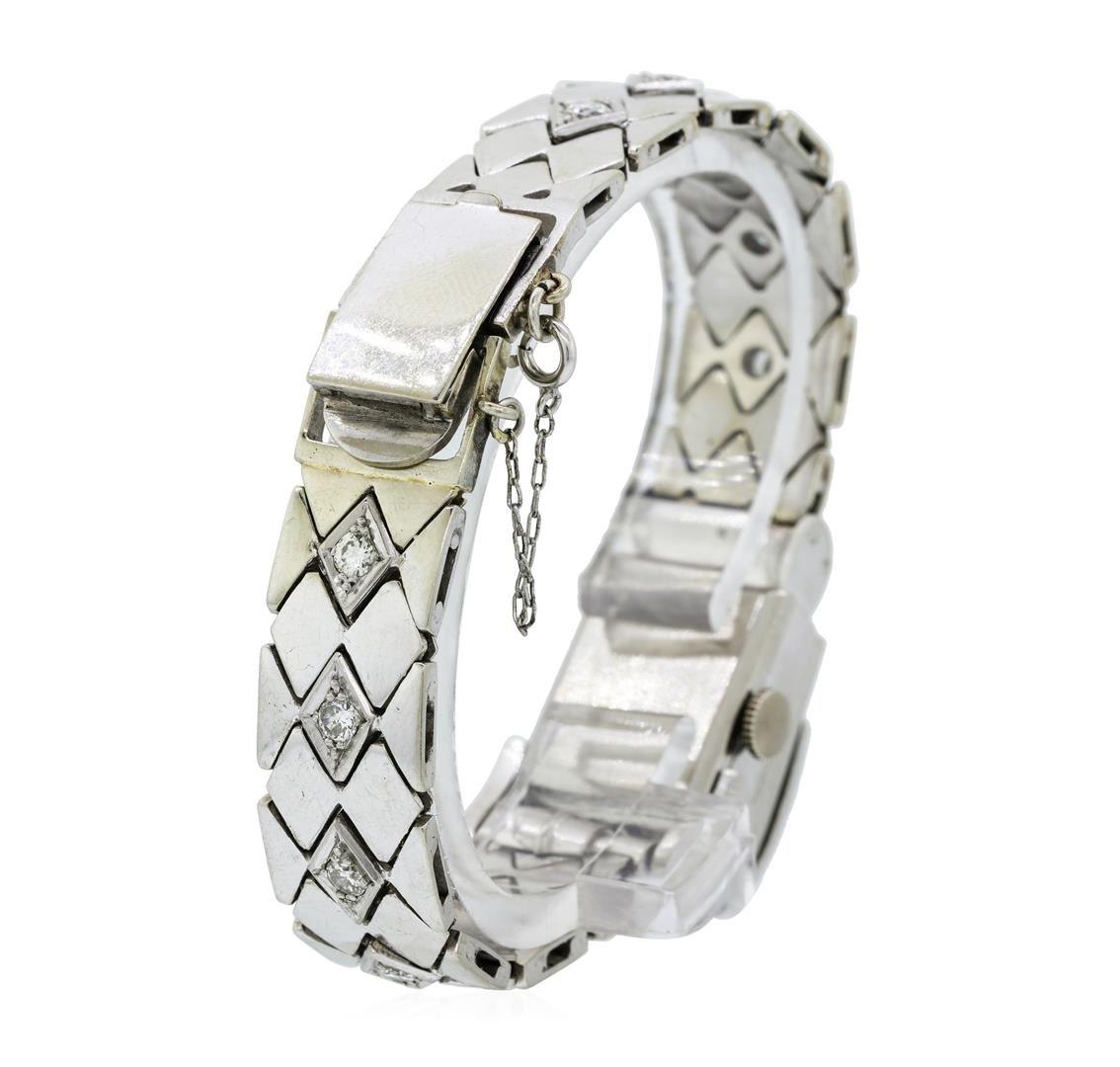 One lady's, hand fabricated Longines retangular shape case bracelet watch electronically tested platinum and 14KT white gold, Crown: pull-out, Crystal: flat glass, Movement: manual wind 17 jewel, Dial: silver satin with baton, pointed type hands and gold dot marker numerals, Bracelet: matching link style band, Condition: G-4 average. The featured wristwatch has a platinum case with an attached 14KT white gold strap. Containing: Four prong set round brilliant cut diamonds, measuring 3.20 - 2.90 x 1.89mm (depth est.) approximate total weight of 4 Stones = 0.40 ct. Graded in the setting. Color H - I Clarity SI-1 to SI-2 Cut Good Thirty-Seven prong set round brilliant cut diamonds, measuring 2.60 - 2.10 x 1.46mm (depth est.) approximate total weight of 37 Stones = 1.80 ct. Graded in the setting. Color H - J Clarity SI-1 to I-1 Cut Good Three channel set baguette cut diamonds, measuring from 4.00 x 2.50 x 2.13mm (depth est.) to 4.10 x 2.70 x 2.30mm (depth est.) approximate total weight of 3 Stones = 0.64ct. Graded in the setting. Color G - H Clarity VS-1 to VS-2 Cut Very Good. Total Weight of Diamonds 2.84ct.. Total Weight of Watch 54.90gm GAS Appraised at $9090.00. GAS Appraised.