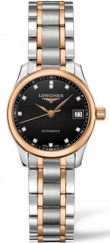 Model: L2.128.5.59.7 - CASE = [Material:Stainless Steel and Rose Gold], [Case Diameter:25.5], [Case Thickness:9mm], [Bezel:Fixed], [Case Back:Skeleton], [Water Resistant:30 Meters - 100 Feet], [Crystal:Scratch Resistant Sapphire], DIAL = [Color:Black], MOVEMENT = [Type:Automatic], [Crown:Push In], BAND = [Clasp:Deployment], [Type:Stainless Steel and Rose Gold], (In Stock - Ready to ship.)