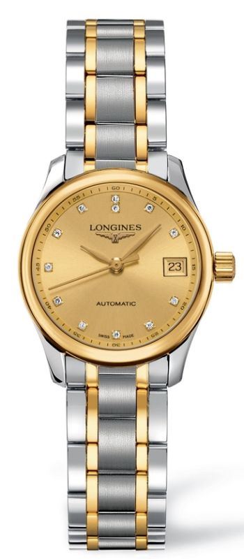 Model: L2.128.5.37.7 - CASE = [Material:Polished 18K Yellow Gold and Stainless Steel], [Case Diameter:25.5], [Case Thickness:9mm], [Bezel:Fixed 18K Yellow Gold], [Case Back:See-thru Sapphire], [Water Resistant:30 Meters - 100 Feet], [Crystal:Scratch Resistant Sapphire], DIAL = [Color:Champagne with Diamond Hour Markers and Date at 3], MOVEMENT = [Type:Automatic Self Winding Calibre L595 with apr 40 hours of power reserve], [Crown:Winding], BAND = [Clasp:Double Push Button Deployment Buckle], [Type:Polished 18K Yellow Gold and Stainless Steel], (Usually ships in 1 to 2 weeks.)