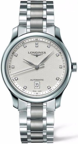 Model: L2.628.4.77.6 - CASE = [Material:Brushed and Polished Stainless Steel], [Case Diameter:38.5], [Case Thickness:9.5mm], [Bezel:Fixed], [Case Back:See-thru Sapphire crystal], [Water Resistant:30 Meters / 100 Feet], [Crystal:Scratch Resistant Sapphire],; DIAL = [Color:Silver Textured with Diamond Hour Markers and Date at 6 (total 0.055 carats)],; MOVEMENT = [Type:Automatic Self Winding],; BAND = [Clasp:Hidden Folding Push Button], [Type:Brushed and Polished Stainless Steel], (Usually ships in 1 to 2 weeks.)
