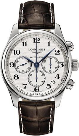 Model: L2.693.4.78.3 - CASE = [Material:Brushed and Polished Stainless Steel], [Case Diameter:44], [Bezel:Fixed], [Case Back:See-thru Sapphire crystal], [Water Resistant:30 Meters / 100 Feet], [Crystal:Scratch Resistant Sapphire], DIAL = [Color:Silver Textured Roman Numeral Chronograph with Date Between 4 and 5], MOVEMENT = [Type:Automatic Self Winding], BAND = [Clasp:Hidden Folding Push Button], [Type:Brown Crocodile Leather], (Usually ships in 1 to 2 weeks.)