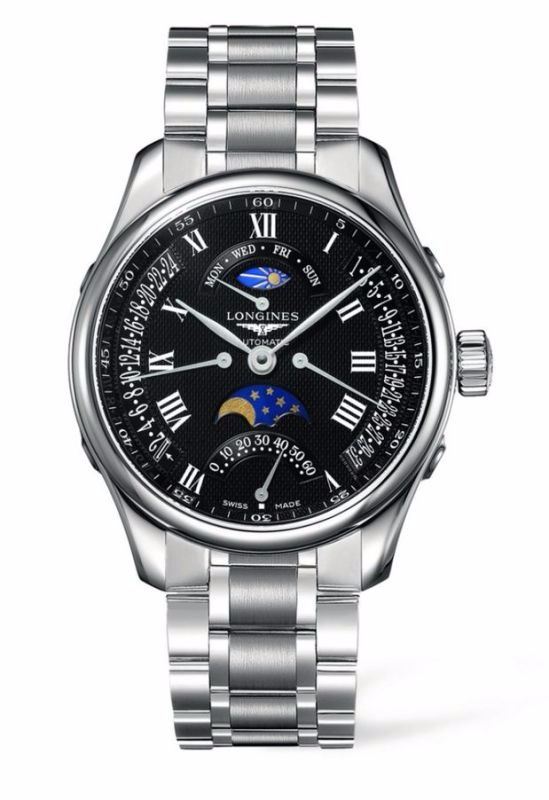 Model: L2.739.4.51.6 - CASE = [Material:Stainless Steel], [Case Diameter:44], [Water Resistant:30 Meters - 100 Feet], [Crystal:Scratch Resistant Sapphire],; DIAL = [Color:Black with Day & Date Calendar and Moonphase Features],; MOVEMENT = [Type:Automatic],; BAND = [Clasp:Deployment], [Type:Stainless Steel], (Usually ships in 4 to 8 weeks.)