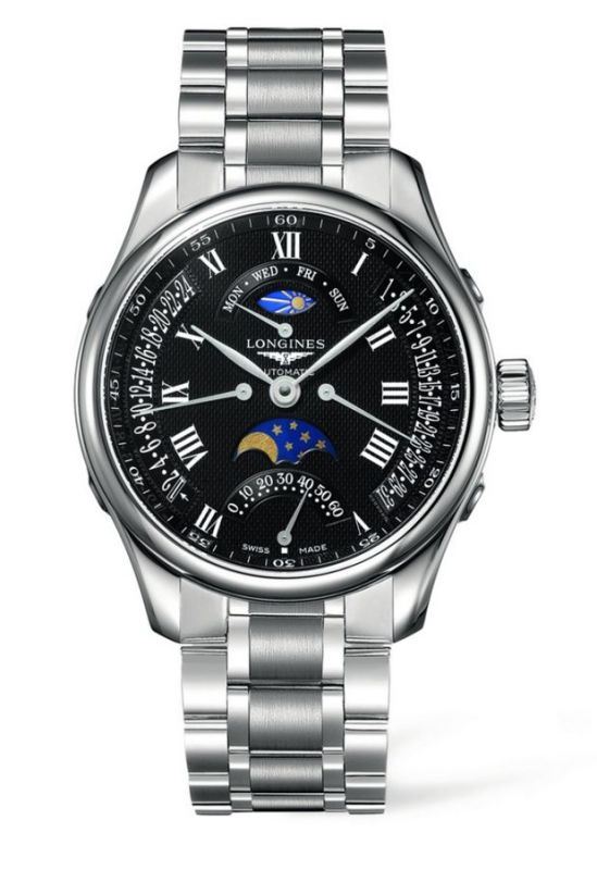 Model: L2.739.4.51.6 - CASE = [Material:Stainless Steel], [Case Diameter:44], [Water Resistant:30 Meters - 100 Feet], [Crystal:Scratch Resistant Sapphire], DIAL = [Color:Black with Day & Date Calendar and Moonphase Features], MOVEMENT = [Type:Automatic], BAND = [Clasp:Deployment], [Type:Stainless Steel], (Usually ships in 4 to 8 weeks.)