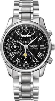 Model: L2.673.4.51.6 - CASE = [Material:Brushed and Polished Stainless Steel], [Case Diameter:40], [Case Thickness:14mm], [Bezel:Fixed], [Case Back:See-thru Sapphire crystal], [Water Resistant:30 Meters / 100 Feet], [Crystal:Scratch Resistant Sapphire],; DIAL = [Color:Black Textured Roman Numeral Chronograph with Day, Date, Month and Moon Phase Features],; MOVEMENT = [Type:Automatic Self Winding],; BAND = [Clasp:Hidden Folding Push Button], [Type:Brushed and Polished Stainless Steel], (Usually ships in 1 to 2 business days.)