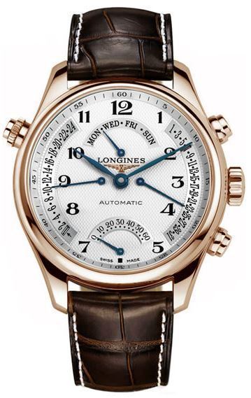 Model: L2.717.8.78.3 - CASE = [Material:18kt Polished Rose Gold], [Case Diameter:44], [Case Thickness:16.1mm], [Bezel:Fixed], [Case Back:See-thru Sapphire crystal], [Water Resistant:30 Meters - 100 Feet], [Crystal:Scratch Resistant Sapphire], DIAL = [Color:Arabic Numeral Hour Markers, Retrograde Date Displayed on Right Side of , Retrograde Seconds at 6, GMT Second Time Zone Feature on Left Side], MOVEMENT = [Type:Longines Caliber L698 with Approx. 48 Hr. Power Reserve], [Crown:Winding, Screw Down Crown on Left Side of Controls GMT Feature], BAND = [Clasp:Double Folding Deployment Buckle], [Type:Brown Crocodile Leather], (Usually ships in 1 to 2 weeks.)