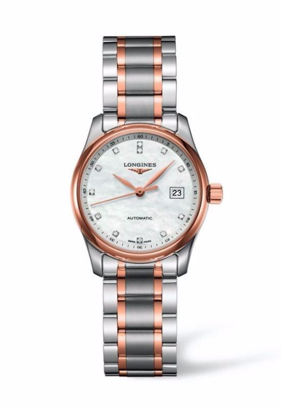 Model: L2.257.5.89.7 - CASE = [Material:Stainless Steel], [Case Diameter:29], [Bezel:Fixed], [Case Back:Skeleton], [Water Resistant:30 Meters - 100 Feet], [Crystal:Scratch Resistant Sapphire],; DIAL = [Color:White Mother of Pearl with Gold Hands and Diamond Hour Markers],; MOVEMENT = [Type:Automatic], [Crown:Push In],; BAND = [Clasp:Deployment], [Type:Stainless Steel and Rose Gold], (Usually ships in 1 to 2 weeks.)